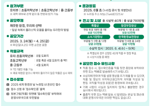 이번 그림 공모전은 28년 만에 우리나라 제주도에서 열리는 ‘2025년 세계 환경의날’을 기념하고 미래 세대 주역인 어린이들과 청소년들의 관심을 높이기 위해 마련되었습니다.