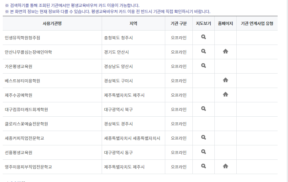 - 평생교육바우처 홈페이지에서 지역별 이용 가능한 기관을 확인하실 수 있습니다.