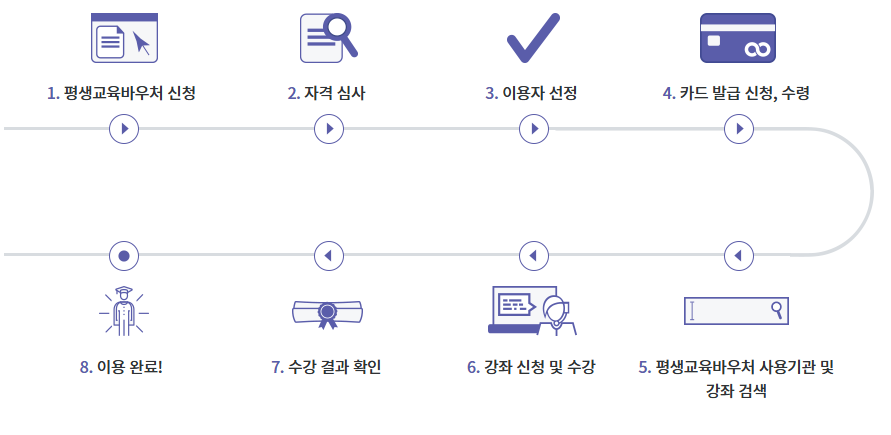 신청 절차는 매우 간편합니다. 평생 교육 바우처 웹사이트를 방문해서 온라인으로 신청하시면 국립 평생 교육 센터에서 자격을 확인한 후 바우처를 발급해 줍니다. 신청 절차는 다음과 같습니다.
