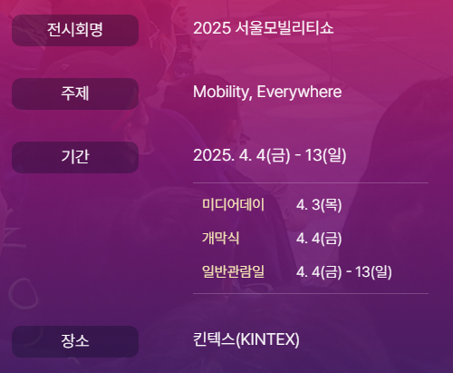 서울 모빌리티쇼가 2025년 4월 3일부터 13일까지 경기도 고양시 킨텍스에서 개최될 예정입니다.